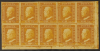 1859 - 1/2 gr. I tavola arancio carta di Palermo blocco orizzontale di dieci esemplari angolo di foglio inferiore destro (pos. 86/90 e 96/100 con "ritocco" 99) - Raro - Firme A.D. e Grioni