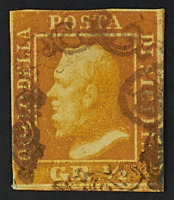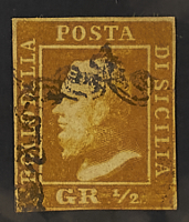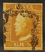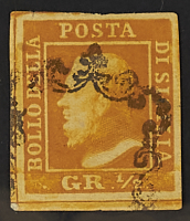 1/2 gr. I tavola arancio carta di Napoli con impronte di due diversi annulli (frode postale) - Cert. Diena