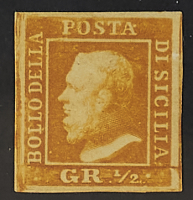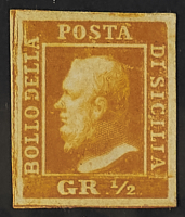1859 - 1/2 gr. I tavola giallo brunastro - Molto raro - Cert. Savarese - Firma A. Diena
