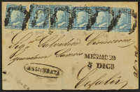 1859 - 2 gr. I tavola azzurro chiaro carta di Palermo sei esemplari (tra cui pos. 81 e 84 con "ritocco") su assicurata del 5 dicembre da Messina per Cefalù - Affrancatura scenografica e di notevole rarità - Cert. Diena