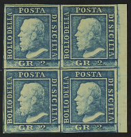 1859 - 2 gr. III tavola azzurro chiaro blocco di quattro esemplari bordo di foglio a destra - Firme G. Bolaffi e A.D.
