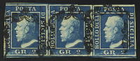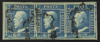 1859 - 2 gr. III tavola azzurro vivo striscia orizzontale di tre esemplari (pos. 97/99) - Firme E. Diena, A.D., Oliva e Raybaudi