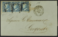 1859 - 2 gr. III tavola azzurro scurissimo tre esemplari su assicurata del 28 luglio da S. Stefano di Camastra, ovale in rosso sulla soprascritta, per Messina - Documento non comune e francobolli ben conservati nel colore - Cert. Cardillo - Firma A.D.