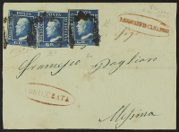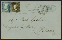 1859 - 1 gr. III tavola verde oliva + 2 gr. III tavola azzurro entrambi carta di Palermo su lettera del 3 aprile 1860 da Marsala per Palermo arrivata il 5 aprile (secondo giorno di insurrezione al Convento della Gancia) - Firma En. D.
