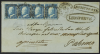 1859 - 2 gr. III tavola azzurro verdastro striscia orizzontale di quattro esemplari su assicurata dell'agosto da Leonforte, ovale sulla soprascritta, per Palermo - Documento assai raro e scenografico - Piega preesistente all'affrancamento che non interessa i francobolli read all