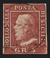 1859 - 5 gr. I tavola rosa carminio annullato con cerchio "Palermo Partenza" - Non comune