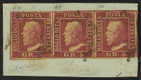 1853 - 5 gr. I tavola rosa carminio striscia orizzontale di tre esemplari (pos. 88/90) su piccolo frammento - Cert. Diena
