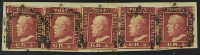 1859 - 5 gr. I tavola rosa carminio cinque esemplari (pos. 76, 77, 78, 79, 80) su piccolo frammento - Ex collezione Burrus (asta Robson Lowe 1/2 dicembre 1964 lotto 301)