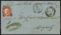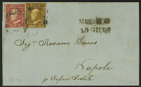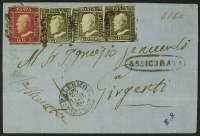 1859 - 5 gr. I tavola rosso sangue + 1 gr. II tavola verde oliva grigiastro coppia orizzontale ed esemplare singolo su assicurata del 23 agosto da Palermo per Girgenti - Affrancatura rara - Cert. Diena