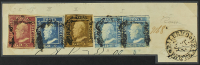 1859 - 1 gr. II tavola bruno oliva + 2 gr. I tavola azzurro chiaro carta di Palermo coppia orizzontale + 2 gr. III tavola azzurro + 5 gr. I tavola rosa carminio in affrancatura "quadricolore" su frammento di lettera del 2 settembre da Palermo - Non comune - Lieve piega read all