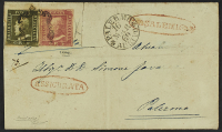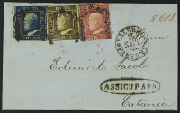 1859 - 5 gr. I tavola rosa carminio + 1 gr. III tavola verde oliva carta di Palermo + 10 gr. azzurro cupo in affrancatura "tricolore" su assicurata del 3 settembre da Palermo per Catania