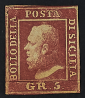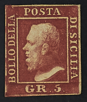 1859 - 5 gr. I tavola carminio - Unito altro esemplare (senza gomma) nella gradazione carminio scuro