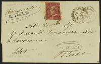 1859 - 5 gr. I tavola carminio isolato su assicurata dell'8 giugno da Girgenti, cerchio sulla soprascritta, per Palermo - Tariffa probabilmente unica - Piega verticale da esaminare - Cert. Cardillo