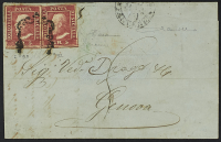 1859 - 5 gr. I tavola carminio due esemplari su lettera del 27 marzo 1860 da Palermo per Genova viaggiata con il vapore "Elettrico" della Compagnia "Florio" - Rara - Cert. Cardillo e Diena - Firma Grioni
