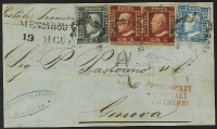 1859 - 5 gr. I tavola carminio scuro coppia orizzontale bordo di foglio inferiore + 2 gr. I tavola azzurro chiaro carta di Palermo + 20 gr. grigio ardesia su frontespizio di lettera del 15 dicembre da Messina per Genova - Combinazione di notevole rarità - Da esaminare - read all