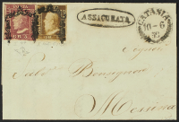 1859 - 1 gr. I tavola bruno ruggine intenso pos. 57 "ritocco" + 2 gr. III tavola azzurro su lettera del 5 ottobre da Catania per Messina tassata in arrivo per insufficiente affrancatura - Cert. Diena