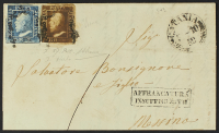 1859 - 1 gr. II tavola - Due lettere entrambe affrancate con due esemplari comprendenti rispettivamente i "ritocchi" 82 e 89 - Da esaminare - Firma E.D.