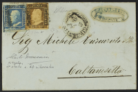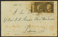 1859 - 1 gr. II tavola bruno oliva due esemplari pos. 52 "ritocco" e 57 su lettera del 2 agosto da Palermo per Trapani - Indirizzo parzialmente rifatto