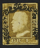 1859 - 1 gr. II tavola sette esemplari con tutti i "ritocchi" conosciuti (13, 52, 59, 69, 82, 84, 89) - Unito altro esemplare usato pos. 62 con "ritocco" eseguito posteriormente - Cert. Cardillo - Firme E.D., A.D., Oliva e Raybaudi