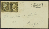 1859 - 1 gr. II tavola verde oliva grigiastro coppia orizzontale (pos. 83/84 "ritocco") su lettera del 13 ottobre da Modica per Messina - Da esaminare