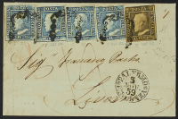 1859 - 1 gr. II tavola verde oliva grigiastro pos. 82 "ritocco" + 2 gr. I tavola azzurro chiaro due esemplari carta di Napoli con pos. 82 "ritocco" e due esemplari carta di Palermo con pos. 84 "ritocco" su lettera del 5 novembre da Palermo per Livorno - Documento ben read all