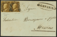 1859 - 1 gr. II tavola bruno oliva coppia orizzontale pos. 69 "ritocco"/70 su lettera del 23 marzo da Catania per Messina - Da esaminare - Firma A.D.
