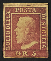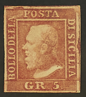1859 - 5 gr. I tavola vermiglio chiaro due esemplari pos. 5 e 10 entrambi con "ritocco" - Cert. Cardillo e Colla - Forma Oliva