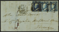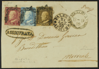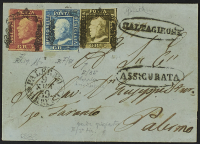 1859 - 5 gr. I tavola carminio pos. 5 "ritocco" + 1 gr. II tavola bruno oliva + 2 gr. I tavola azzurro carta di Palermo in affrancatura "tricolore" su assicurata del 19 settembre da Siracusa, cerchio sulla soprascritta, per Monreale - 2 gr. leggermente corto in alto ma read all