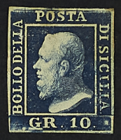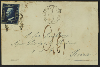 1859 - 10 gr. indaco pos. 11 "ritocco" su lettera del 1° febbraio 1860 da Palermo per Roma- Francobollo ritagliato su rettangolo di carta e poi ricollocato nella sua posizione originaria - Cert. Diena