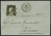 1859 - 1 gr. III tavola verde oliva carta di Napoli + 5 gr. II tavola vermiglio + 10 gr. azzurro cupo pos. 60 "ritocco" + 50 gr. lacca bruno pos. 93 "ritocco" in affrancatura "quadricolore" su lettera del 14 maggio 1860 (primo giorno della dittatura di Garibaldi in read all