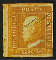 1859 - 1/2 gr. I tavola arancio carta di Palermo bordo di foglio a sinistra con leggera doppia stampa e annullo a penna. Riparazione da esaminare ma unico esemplare conosciuto - Cert. Diena