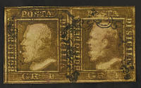 1859 - 1 gr. II tavola bruno oliva doppia stampa coppia orizzontale - Rara - Da esaminare - Cert. Colla - Firma A.,D.