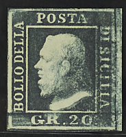 1859 - Stampa secca - I sette valori dell'emissione con evidente inchiostrazione "povera" dovuta alla secchezza dell'inchiostro - Cert. Raybaudi - Firme E.D. e A.D.