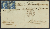 1859 - Mistretta - Ovale su gran parte di assicurata, ovale a lato, per Palermo (arrivata il 23 aprile) affrancata con 2 gr. II tavola azzurro vivo coppia orizzontale - Rara - Da esaminare - Cert. Colla