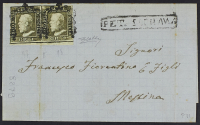 1859 - Petralia Soprana - Cartella su lettera del 19 dicembre per Messina affrancata con 1 gr. II tavola oliva grigiastro coppia orizzontale bordo di foglio inferiore - Piega d'archivio precedente l'applicazione dei francobolli - Cert. Colla
