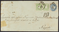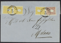 1862/63 - 3 s. verde giallo due esemplari in affrancatura mista con IV emissione 10 s. azzurro chiaro su circolare del 16 dicembre 1863 da Verona per Napoli - Affrancatura non comune - Cert. Diena