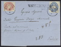 1864 - 5 s. rosa + 10 s. azzurro su raccomandata del 5 gennaio 1866 da Verona per Padova - raro uso di entrambi i valori sul frontespizio in violazione del regolamento postale che prevedeva l'applicazione del francobollo del porto di raccomandazione al verso - Cert. read all