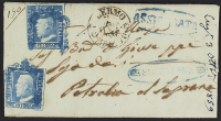 1859 - Pietraperzia - Ovale in rosso su assicurata (ovale in rosso a lato) per Palermo (arrivo il 20 aprile) affrancata con 2 gr. I tavola azzurro carta di Napoli due esemplari - Estremamente rara (tre lettere note) - Cert. Colla