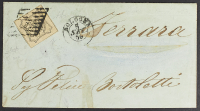 1855 - 5 baj. rosa II tipo su lettera di piccolo formato del 21 gennaio 1856 da Bologna per Firenze - Molto bella - Unito frammento con otto esemplari del medesimo francobollo (da esaminare) - Cert. Bolaffi e Diena