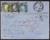 1859 - 1 gr. II tavola verde oliva grigiastro + 2 gr. III tavola azzurro chiaro + 20 gr. grigio ardesia in affrancatura "tricolore" su lettera del 14 febbraio 1860 da Messina per la Grecia - 2 gr. leggermente corto a sinistra ma affrancatura di grande rarità - Unito read all