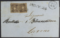 1860 - 10 c. bruno due esemplari, annullati con griglia pontificia, su assicurata del 10 ottobre da Orvieto per Livorno - Documento di rarità estrema - Minime mancanze di carta alla lettera e indirizzo parzialmente cancellato ma francobolli ben marginati per la read all