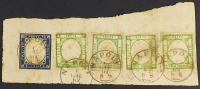 1855/61 - 1/2 t. verde quattro esemplari in affrancatura mista con Sardegna IV emissione 20 c. indaco su piccolo frammento - Unito altro piccolo frammento con 2 gr. azzurro chiaro in affrancatura mista con Sardegna IV emissione 20 c. celeste - Da esaminare - Cert. Diena read all