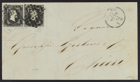 1851 - 5 c. nero coppia orizzontale su circolare del 13 ottobre 1852 da Torino per Chieri - Secondo esemplare lievemente corto in basso ma documento raro e ben conservato - Cert. Bolaffi e Diena