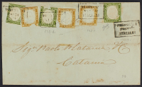 1855 - 5 c. verde oliva giallastro + 20 c. azzurro oltremare tre esemplari su assicurata del 23 marzo 1862 da Sciacca per Palermo - Documento non comune - Da esaminare - Cert. Cardillo