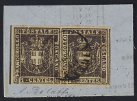 1860 - 1 c. violetto bruno coppia orizzontale su piccolo frammento annullato a Firenze - Unito altro frammento con 20 c. azzurro - Margini eccezionali - Firma A. Bolaffi