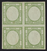 1861 - 1/2 t. verde giallo effigie capovolta blocco di quattro - Molto raro - Da esaminare - Cert. Diena