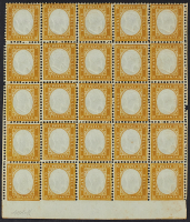 1862 - Prima emissione dentellata 80 c. giallo arancio blocco di venticinque con i cinque esemplari inferiori non dentellati (bordo di foglio) - Dentellature lievemente "aperte" in un paio di punti ma multiplo assai fresco e vivo nel colore - Firma G. Bolaffi