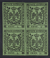 1855 - 5 c. verde oliva due blocchi di quattro di cui uno con interspazio di gruppo orizzontale (piega in corrispondenza dello stesso) e uno con il secondo esemplare con varietà punto in alto dopo la cifra "5"