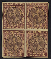 1893 - Nozze d'argento non emesso 20 c. - Prova nel colore adottato in blocco di quattro su cartoncino patinato e non dentellato - Molto rara - Cert. Raybaudi