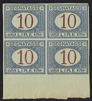 1893 - Definitiva 10 L. azzurro e carminio - Prova di stampa in blocco di quattro bordo di foglio inferiore su carta grigiastra senza filigrana e dentellatura - Cert. Sorani